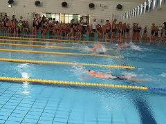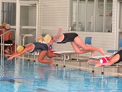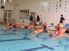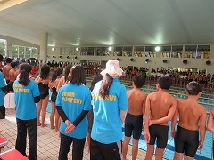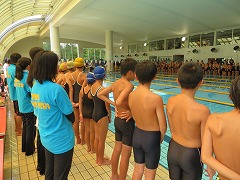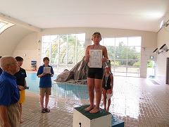6年生の背泳ぎでは、大会新記録で山田くんが1位となりました。