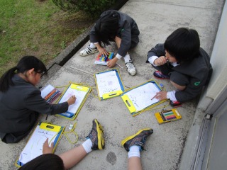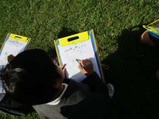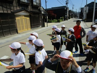 子どもたちは町の様子を観察しながら、発見したことをカードに書いていました。