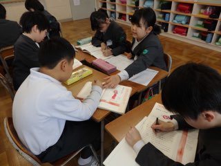 2018年3月13日 17時30分4年2組の国語の時間では、登場人物や場面の様子が伝わるように、音読の工夫について考えました。グループごとに場面を分けて、最後にはみんなの音読を録音し、1つのお話につなげます。いよいよ、明日が録音の日!どきどきしている子どもたちですが、この21人で協力して仕上げる、最後の作品になりそうです。