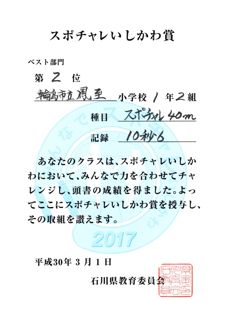 スポチャレいしかわの取組において、1年2組が石川県の小学校1年生の中で、2位になりました。種目は40m走です。ベストタイムを競うベスト部門で第2位となりました。大変すばらしい結果です。来年は1位を取りたいですね。