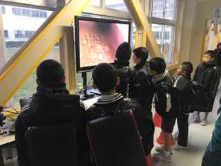 朝登校した児童は、テレビ画面をみたり顕微鏡のレンズをのぞいて興味津々。