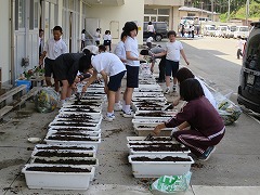 今日プランターの土替えを「環境委員会」の子どもたちがしました。