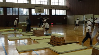 今回は、前半部分を開脚跳び、抱え込み跳び。 後半を台上前転で行いました。
