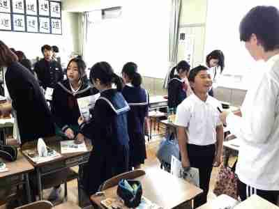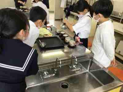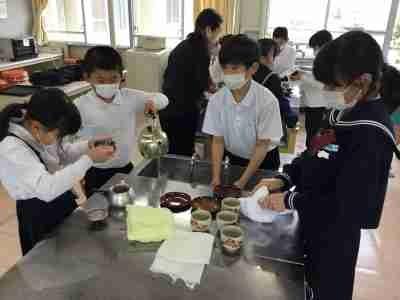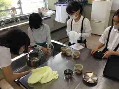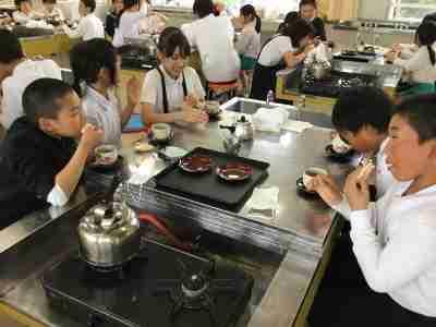 家庭科で、お茶の入れ方を学びました。食器を洗ったり、湯を沸かしたり、お茶の分量を量ったり、みんなで協力して準備をします。同じ濃さになるようにお茶を入れたら「お茶タイム」です。楽しくお話ししながら、ほっと一息できる時間を過ごしました。