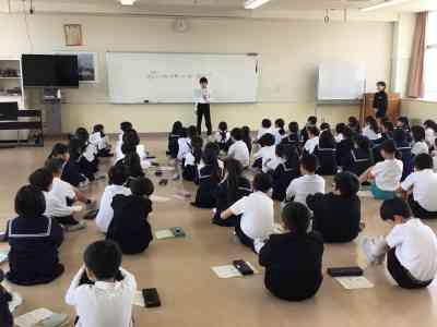 栄養教諭の先生が、給食のことについてお話に来てくださいました。献立や食材、栄養のことについてよくわかりましたね。今年度は、バランスの良い食べ方などについてのお話もしてくださいます。楽しみですね。