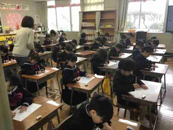 国語の時間。鉛筆の持ち方と姿勢を確認して、集中してお名前を書いています。みんなとっても頑張っています。すばらしいです!