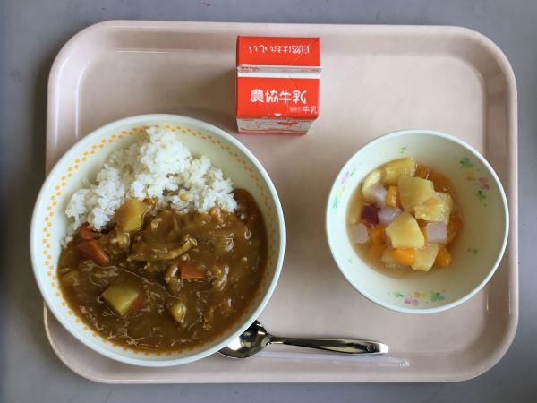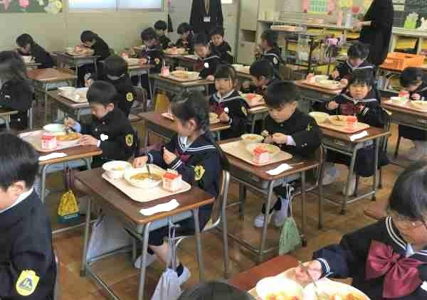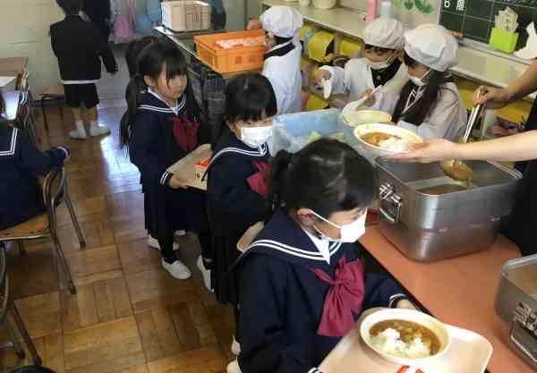 今日から1年生の給食が始まりました。まず、お当番のやり方の説明を聞きます。配膳車係さんが配膳車を運んで、給食当番さんが盛り付けます。上手に盛り付けた給食を一人一人がお盆にのせて、みんな揃って「いただきます!」今日のメニューはカレーライス。おいしかったですね。