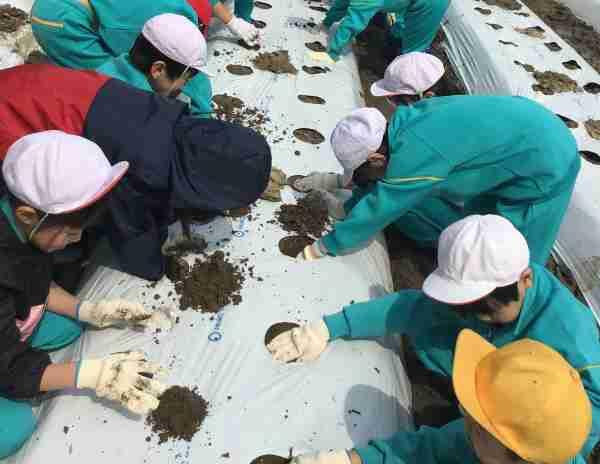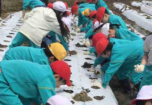 4月17日、3年生が「まるいも」の植え付け体験を行いました。地域の先生に丸いものことや植え方を教えていただいたあと、「大きくなあれ、まあるくなあれ」と願いを込めながら植えました。この後、3年生は特産品の「まるいも」のことについて、学びを深めていきます。