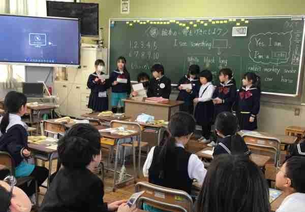 物語を英語劇にして発表します。上手に言えるかな。