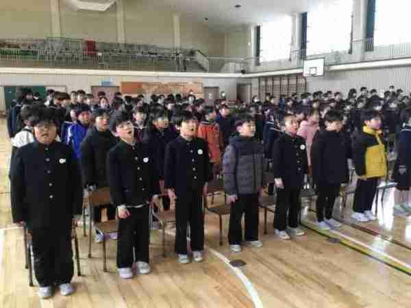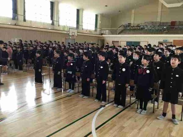 1~5年生が集まって卒業式の練習を行いました。呼びかけはだんだんタイミンングが合い上手になりました。歌声も体育館中に響きとてもきれいでした。姿勢や立つタイミングなども確認しました。全員で気持ちを合わせて、良い式にしましょう。