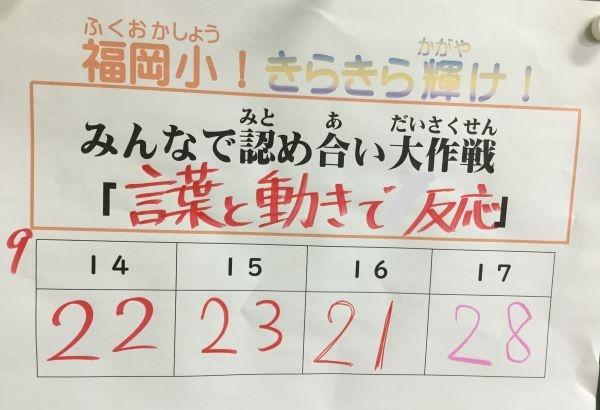 児童が安心して過ごせる学級をめざして「みんなで認め合い大作戦」に取り組んでいます。友達の意見を最後まで静かに聴き「なるほど」「いいね」「同じです」とあたたかな反応を返したり、お互いの振り返りに感想を伝えあったり、各クラスにあった認め合い活動を行っています。各クラスでの取り組みは校内放送で全校に伝え、良い取り組みはどんどん自分のクラスにも取り入れていきます。福岡っ子みんなで認め合い、高め合って伸びていきます。