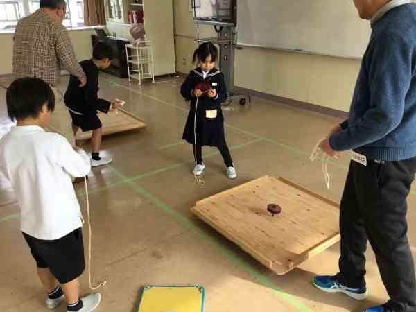 CSさんのご協力を得て「昔あそびの会」を開きました。なわとびやゴムとび、お手玉、あやとり、コマ回し、ふくわらいなどをして楽しみました。町の先生がとっても優しく教えてくださり、遊び方もすぐ覚えられましたね。