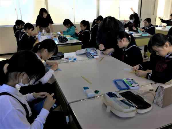 物づくり:ポーチづくり。針と糸の使い方も上手です。