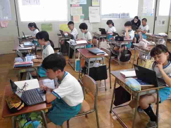5年国語:自分が見つけたユニバーサルデザインについて発表するプレゼンシートを作成中
