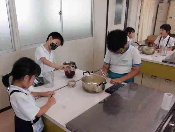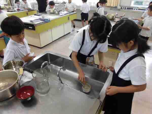 算数の授業で、茶碗や鍋、お椀などの「かさ」を調べました。まずdLマスやLマスを使って、どのくらいか予想を立てます。そのあと、実際に水を入れて調べました。見事に予想が当たった人もいましたね。このように実測を通して、基準となる量の大きさの感じを身につけていってほしいです。