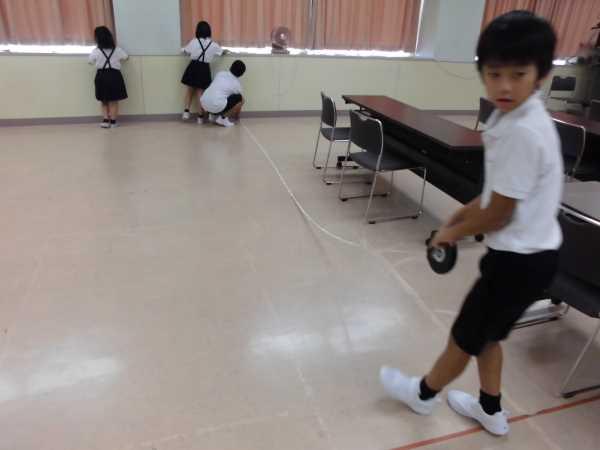 算数の学習で巻き尺を使って長さを測りました。友達と協力しながら、測り始めのところに0を合わせ、たるまないようにぴんと張って測ります。巻き尺を使うと、手すりや長い廊下、丸い椅子の周りも測ることができます。