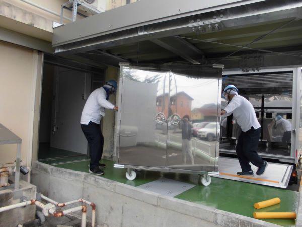 11:40 センターからコンテナに入った給食が届きました。