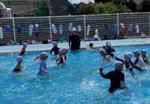 粟生小学校のプールをお借りして、2・3年生の水泳教室が開かれました。プールの中を歩いたり、息継ぎの練習をしたりして、たっぷり水に親しむことができました。とても楽しい時間でしたね。