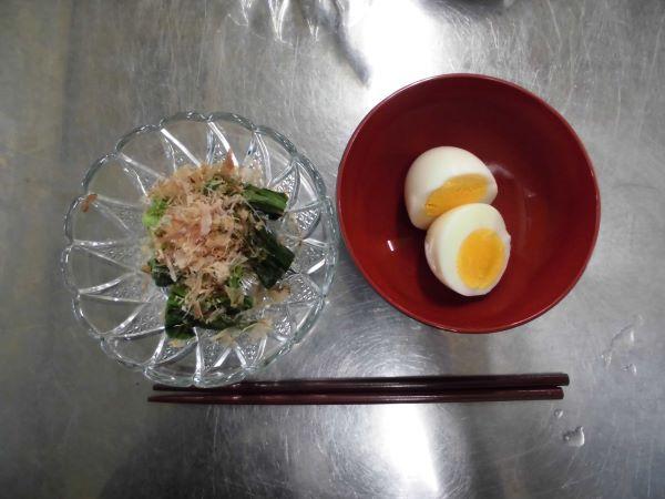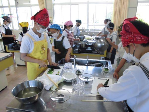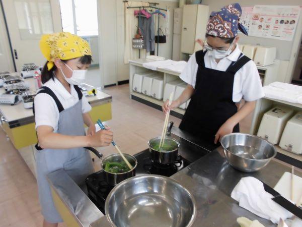 5年生が町の先生に教えていただきながら、青菜と卵を「ゆでる」調理実習を行いました。沸騰してから入れる青菜と、水から入れる卵。火加減や時間に注意しながら上手に「ゆでる」ことができました。とってもおいしそうです。