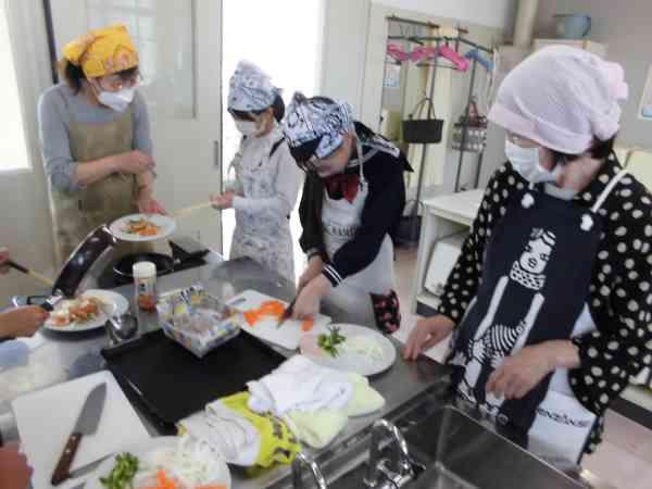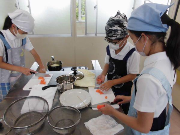 今日のメニューは「野菜の彩炒め」です。野菜に火が通るように切り方や炒める順番を考えながら調理します。どの班もとってもおいしくできました!