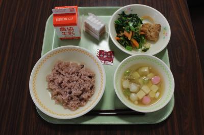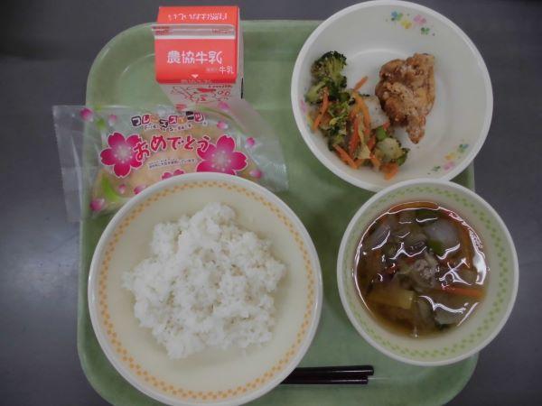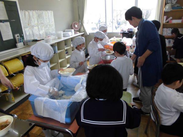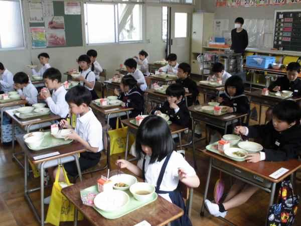 1年生の給食がスタートしました。給食当番さんが上手に盛りつけたごはんやおかずを、一人ひとりセルフ方式で自分のお盆にのせていきます。みんなが準備できるまで静かに待って「いただきます!」今日は、お祝いクレープもついて、とってもおいしかったですね。