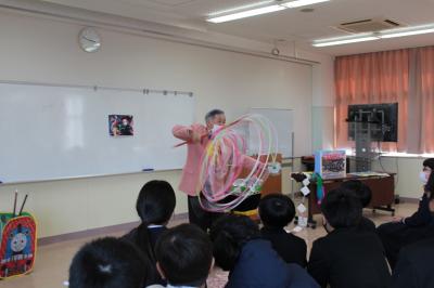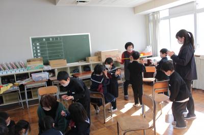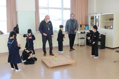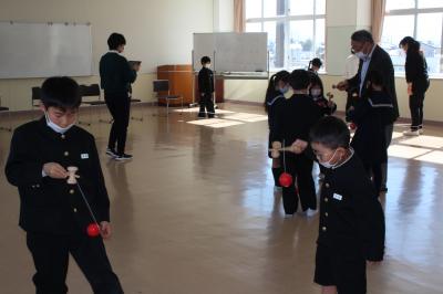 1月31日(火)1年生が3・4限目の生活科の時間に、CS委委員さんや地域の方をお迎えして、「昔遊び」をしました。今年は、2会場に分かれれ、コマ回し・けん玉・ゴムとび・あやとり、おはじき・お手玉に挑戦しました。町の先生方に丁寧に教えていただきながら、昔遊びならではの楽しさを味わった子どもたち。こつをつかんで「できた!」という喜びの声がたくさん聞かれました。町の先生方、寒い中お越しいただきありがとうございました。