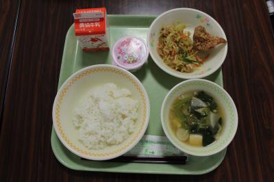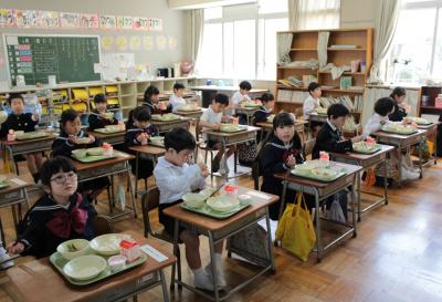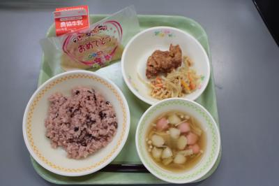 13日(木)、いよいよ1年生の給食がスタートしました。初日の献立は、「ごはん・鶏肉の竜田揚げ・カラフルソテー・みそ汁・お祝いデザート(いちごゼリー)・牛乳」です。準備・配膳・食事の仕方を学び、みんなで「いただきます!」。「おいしい!」「お代わり!」という嬉しい言葉が聞かれました。