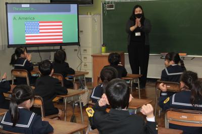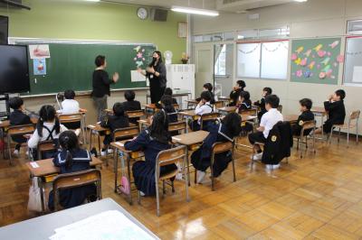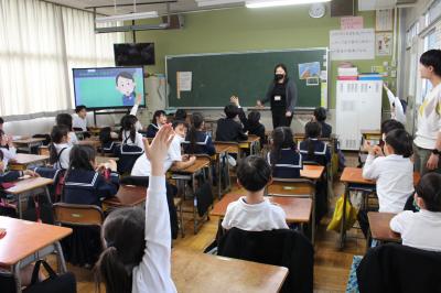 今年度、1.2年生の外国語活動(年間10回)は、昨年度に引き続きALTのミー先生をお迎えして行います。12日(水)はその第1回目。ミー先生が、大型モニターを使ってクイズ形式で自己紹介をしてくださり、とても盛り上がりました。子どもたちは、自分の名前を英語で上手に言えました。これからも元気で明るいミー先生との学習が楽しみですね。