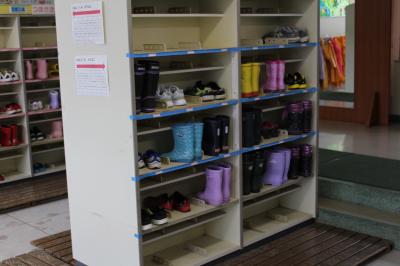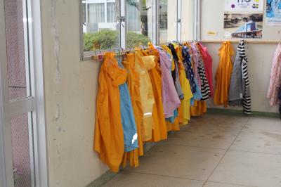 登校後の児童玄関のカッパや傘、履物がきちんとそろっていて、実に気持ちがよいです。