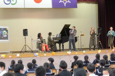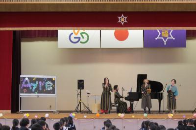 11月1日(火)5限目、体育館で音楽鑑賞会が開かれました。ゲストは、本校のCS事業のテーマ曲ともいえる「TAKARA」や「加賀丸いもの歌」を作ってくださった、4人組ボーカルユニット「Ayre」さんです。子どもたちは、朝の放送や授業でCDを通して曲を聴いていましたが、今回初めて生の歌声や演奏を聴くことができました。オリジナル曲をはじめ、5年生のリードでみんなで歌ったり踊ったりするコーナーもあり、笑顔あふれる楽しいひと時となりました。音楽の力って素晴らしい!