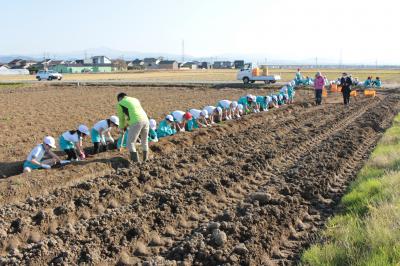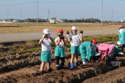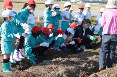 11月9日(水)5・6時間目、3年生が春に植えた丸いもの収穫体験をしました。前日は雨で延期となりましたが、この日は絶好の芋掘り日和。大きくなったかな?まあるくなったかな?おいしくなったかな? ワクワクしながら、岡元農場の岡元さんご夫妻が待つ丸いも畑へ。岡元さんにご挨拶をした後、掘り方のこつなどを教えていただき、大事に大事に丸いもを堀り始めました。次々と収穫される丸いもは、大きさも形もとてもよく、みんな笑顔で喜び合いました。「加賀丸いもの歌」(by Ayer)の歌詞にある通り、100年先も1000年先も受け継がれていますように!