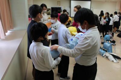 11月24日(木)4年生が福祉の学習で、「のみ♡子育てネットワーク」のスタッフの皆様をお迎えしました。学習のねらいの一つが、妊婦体験を通して、様々な立場の人々が安心して暮らせる住みよい社会をつくるにはどうすればよいかを考えることです。学習道具を詰めた重いランドセルを抱え、荷物を持って階段を上り下りした児童からは、「足元が見づらい。」「重たくて腰が痛い。」といった感想が聞かれました。また、本当の赤ちゃんのように縫いぐるみを愛おしそうに見つめ、優しく抱きかかえる子供たちの表情がとても素敵でした。どんな人にも思いやりをもってあたたかい声掛けができるといいですね。自分ができることを進んで見つけて行動できる勇気をもちましょう。