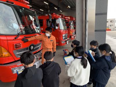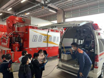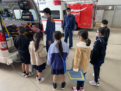 3年生が、能美市消防本部へ社会見学に行きました。社会科では、暮らしを守る人々の学習をしています。今回、消防士さんのお話をお聞きし、実際に自分の目で、消防車・救急車をはじめ通信指令室・仮眠室・トレーニングの部屋などを見て、消防署の仕事や仕組み、そして消防士さん達が安全な暮らしを守るために24時間働いていることを知りました。みんなのために働いてくださっている方への感謝の気持ちと、自分たちの防火についての意識を高める良い機会にもなりました。消防署の皆さん、ありがとうございました。