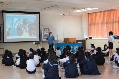 1月17日(火)、23日(月)の二日間、石川県ユニセフ協会のボランティアの皆様方を講師にお迎えして、学習会を行いました。学習会では、各学年に応じたプログラムが用意され、ユニセフとその活動の現状、そしていろいろな国の子どもたちの生活環境について知りました。さらに、体験活動を通して、自分たちがどのような関わりができるのかを一生懸命考える姿が見られました。人権・未来を守ることについて貴重な学びができたことに感謝の気持ちでいっぱいです。協会の皆様、ありがとうございました。今後の児童会の取組につなげていきます。