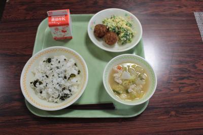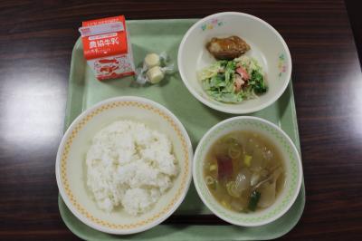 24日(火)の献立名 「わかめごはん・丸いもコロッケ・ブロッコリーと卵のサラダ・豚汁・牛乳」