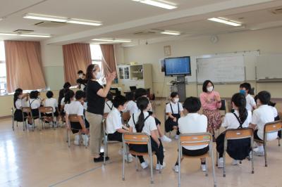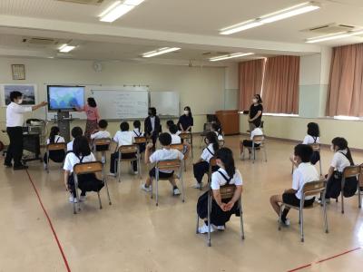 3,4年生が外国語活動の時間に、JAISTの3名の留学生さんとの交流をしました。子どもたちは、留学生の方々の自己紹介を聞き、特に国の紹介(インド・ミャンマー・タイ)に大変興味を持った様子でした。また、これまでの外国語活動で学んだ英語でのやりとりに、ジェスチャーも交えて自己紹介する姿もたくさん見られました。コミュニケーションの楽しさ・すばらしさを実感! 能美市国際交流協会及び留学生の皆さん、ありがとうございました。