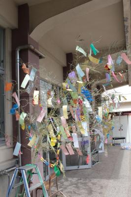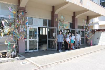 今日7月7日(木)は、七夕祭りです。今年は、CSDの橋本さんが用意してくださった立派な笹に、児童・職員の願い事を書いた短冊と、1・2年生や委員会で作った七夕飾りを飾り付けました。短冊には、みんなの幸せ・平和・健康を願う言葉もたくさん書かれており、胸が熱くなりました。仕上げは、児童会運営委員の6年生が行いました。児童玄関前に色鮮やかに飾られ、サラサラという音もとても涼しげに感じられます。日本の風物詩をCS委員さんや図書ボランティアのみなさんと一緒に作ったことも、大切な思い出になることでしょう。