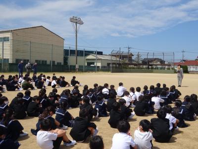 雨天の為延期となった火災を想定した避難訓練が、5月6日(金)の2時間目に実施されました。長い連休の後でしたが、「お(人をおさない)・は(校舎の中は走らない)・し(しゃべらず静かに避難)・も(戻らない)」の約束を守って、正しい避難経路で素早く行動することができました。高学年が良いお手本を示し、大切な命を守る訓練ができたことを能美消防署(根上分署)の方にもほめていただきました。これからも、いろいろな災害等を想定した訓練に、全員で真剣に取り組んでいきましょう。消防署員の皆様、ありがとうございました。