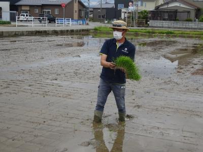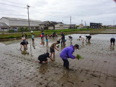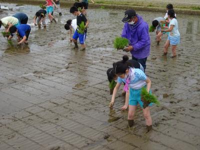 5月11日(水)5・6時間目に、5年生が岡元農場さんの田んぼで、農業体験学習「田植え体験」をしました。苗の観察のときは、あいにくのお天気でしたが、この日は田植え日和。岡元さんに苗植えのご指導をいただいた後、一人一人「ひゃくまん穀」の苗を植えていきました。初めは、泥の感触に戸惑っていた子も、次第に慣れて楽しんで植えることができ、達成感を味わっていました。稲の生長が楽しみですね。大きくなあれ! 岡元農場の皆さん、そしてJA根上の皆さん方のおかげで、貴重な体験ができました。ありがとうございました。