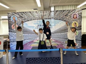 この度「東京2020大会 表彰台レガシープロジェクト」により、東京オリンピックの表彰台が市内各小中学校で展示されることとなりました。本校では先週1週間、1階学習室に展示されました。あの感動が再びよみがえり、先生も子供たちも、どきどきわくわくしながら表彰台に上がって、笑顔で記念撮影をしました。気分はメダリスト!子供たちの夢が膨らみます。