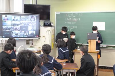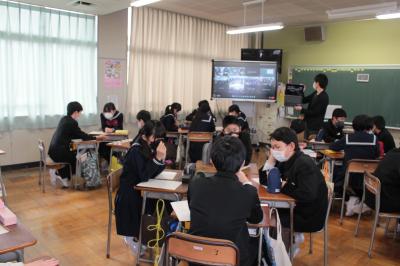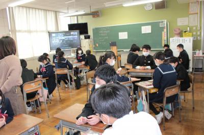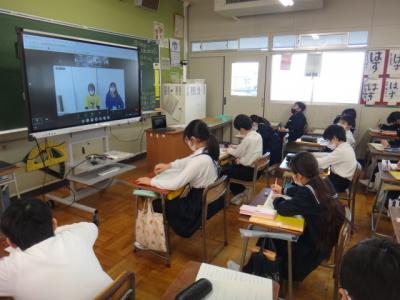 2月3日(木)の5時間目に、4年生が総合的な学習の時間における「福祉」の学習の一環で、能美市国際交流協会会長の喜多さん・職員の吉高さんとズームで交流学習をしました。お二人のお話を聞いた子どもたちは、「国際交流協会の活動を知ることができでよかった。」「外国の人たちの困っていることがわかったので、会ったときに声をかけたい。」という感想を持っていました。外国の人たちとの共生、そしてみんなが幸せに暮らせる能美市について考える貴重な機会となりました。