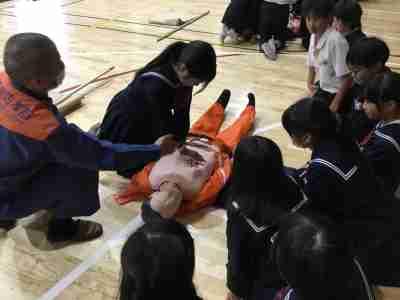 10月28日に6年生が、防災教室を行いました。まず、竹本先生から昭和九年の大水の時の話を聞きました。そこから私たちが住んでいる福岡地区の地形の特徴と、どんなことに気を付ければよいのか教えていただきました。その後、能見消防の方から、避難するときのポイントや救護の仕方を実践を通して教えていただきました。多くの学びがあった有意義な時間でした。