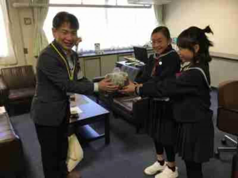 2025年11月12日 17時08分前期児童会役員が、収穫したひまわりの種をひまわり里親プロジェクトの方にお渡ししました。種は福島交通バスのバイオエネルギーとして活用されています。福岡小で育てたひまわりが、東日本大震災の復興へとつながります。