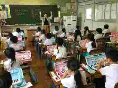 1年:鍵盤ハーモニカの先生に、正しい音の出し方や指づかいについて教えていただきました。最後にはミニ演奏会もありました。