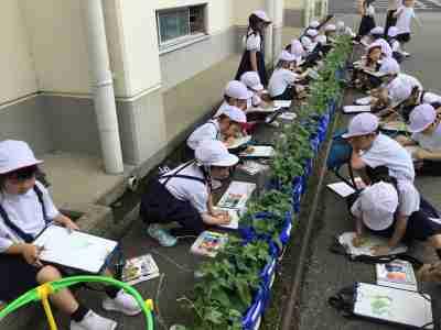 1年:葉の形やつるの形をよく見て朝顔の観察。