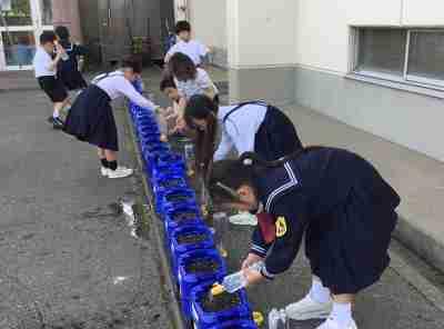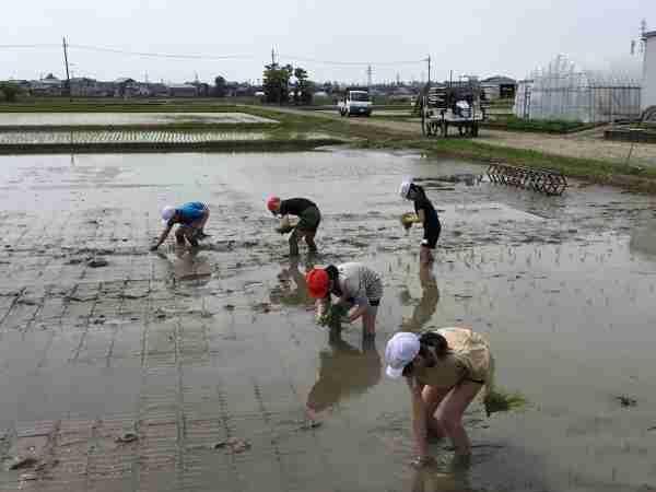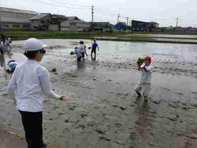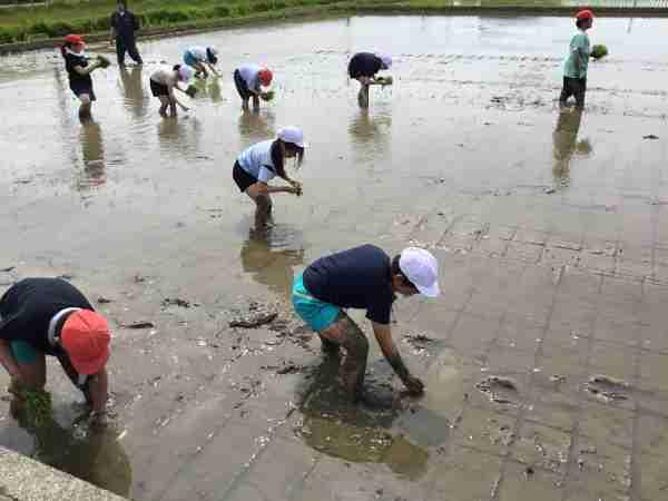 5月15日に岡本農場さんのご協力を得て、田植えを行いました。泥に足をとらせながらも苗を3本ずつ枠の線に合わせて丁寧に植えていきました。食べ物を作ることの大切さと大変さを知ることができました。