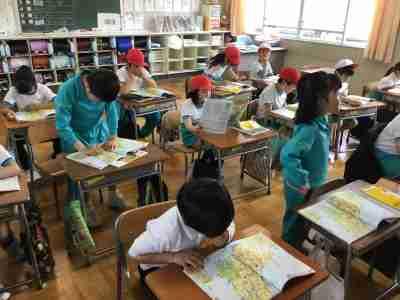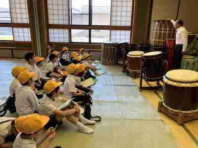 「町のすてきを見つけよう」で、きょうは中ノ庄町に出かけました。虫送り太鼓の歴史や由来を聞き、体験もさせていただきました。神社にも行き、すてきなところをたくさん見つけました。説明してくださった町の先生、ありがとうございます。