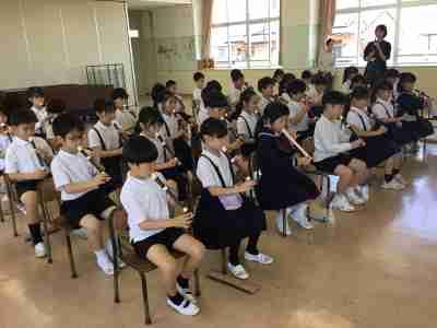 音楽の時間にリコーダーの演奏が始まります。今日は、リコーダーの先生をお招きして、リコーダーを演奏するときの指の動きや息の吹き方、片づけ方などを詳しく教えていただきました。最初はピーッと大きな音でしたが、授業の終わりには、優しいきれいな音が出せるようになりました。