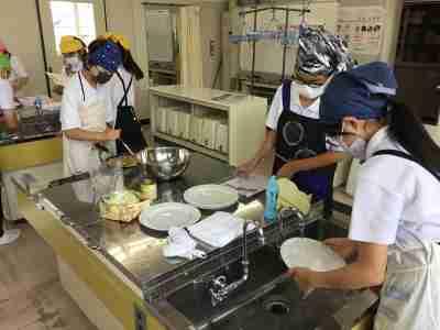 野菜炒めの調理実習。調理・準備・片付けと分担して手際よく進めています。