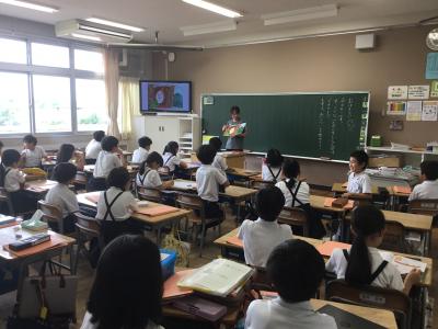 3年生では モニターに大きく映し出される絵も見ながら聞いていました。